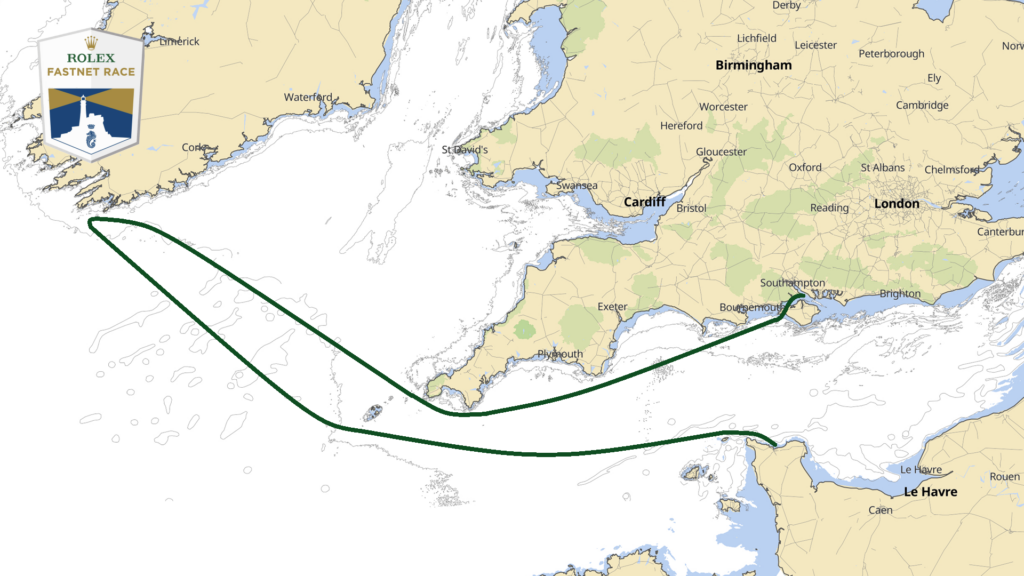Das jeweils in ungeraden Jahren stattfindende Rolex-Fastnet-Race, organisiert vom Royal Ocean Racing Club, startet in Cowes auf der Isle of Wight. Durch den Solent und vorbei an den Needles passiert die Flotte dann die Küsten von Dorset, Devon und Cornwall bevor es hinter Lands End auf die Keltische See geht. Nach Runden des berühmten Fastnet Rock an der Südküste Irlands nehmen die Yachten Kurs auf die Scilly Islands und von dort in den Ärmelkanal. Vorbei an den Kanalinseln mit ihren extremen Tidenströmungen wartet schließlich das Ziel in Cherbourg. Rund 700 Seemeilen liegen dann hinter den Teilnehmern.